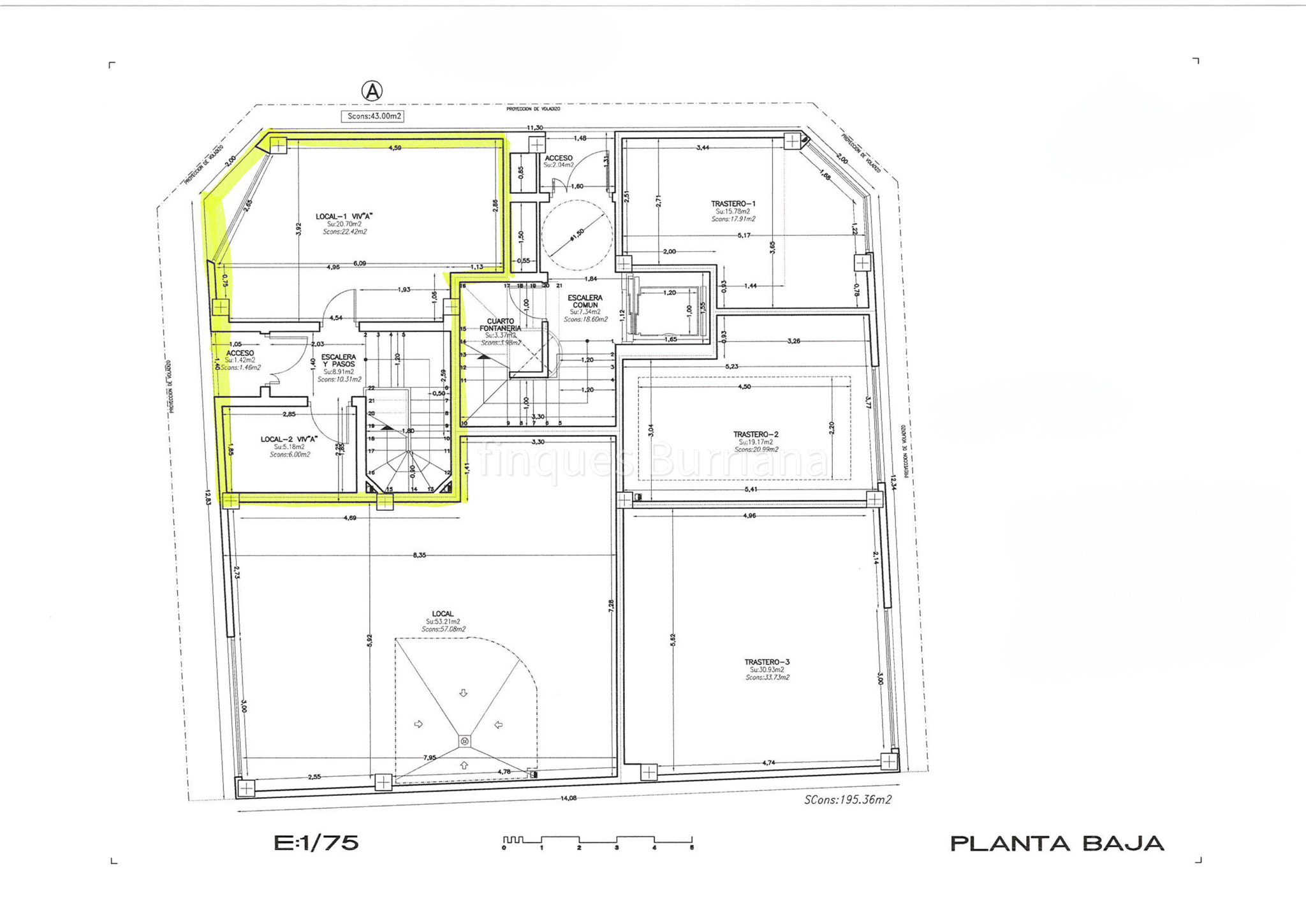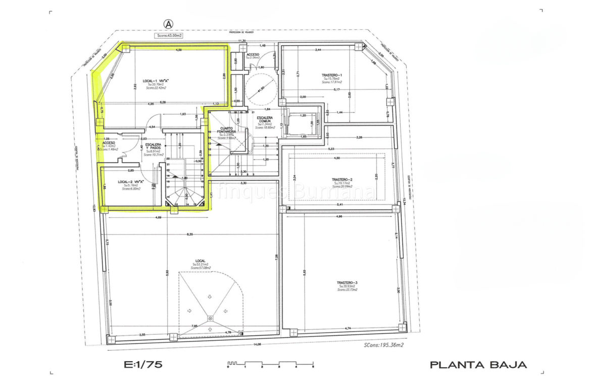 Planta baja también diáfana, con una superficie de 195 m², no incluida en el lote, aunque podría negociarse con la propiedad familiar si el comprador está interesado.